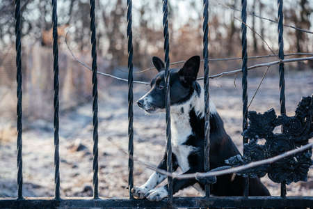 Homeless dog in a cage at the animal shelter. Selective focus.