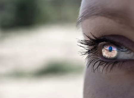 Close-up of an eye reflecting a vast landscape through a captivating double exposure technique