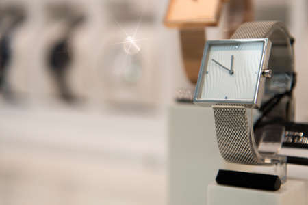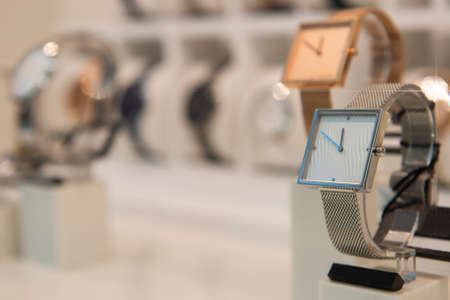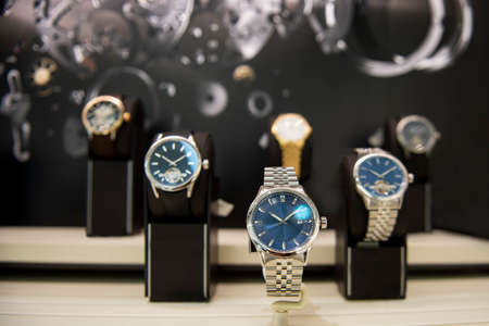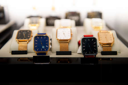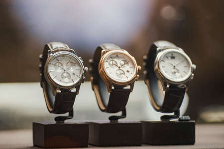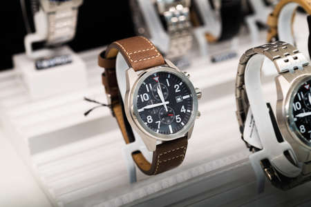 luxury display watches in a luxury store, closeup of wristwat