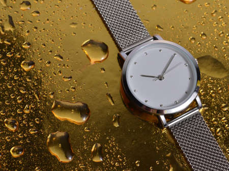 The women's watch lies on a golden table. Water drops on the table.
