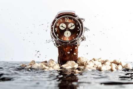 Women's watch and water drops on the table.