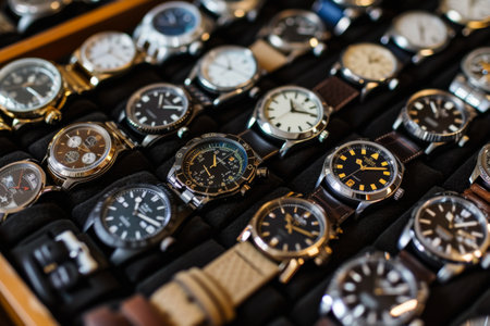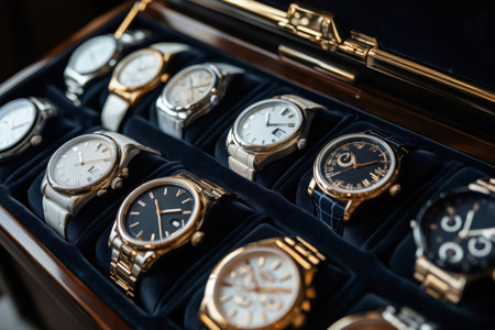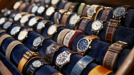 This image showcases an elegant collection of various watches displayed in a retail case. Featuring intricate designs and luxurious materials, these timepieces appeal to watch lovers.