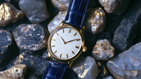 A sophisticated watch is placed gracefully among polished stones, highlighting its detailed face and luxurious leather strap. The setting exudes elegance and calm