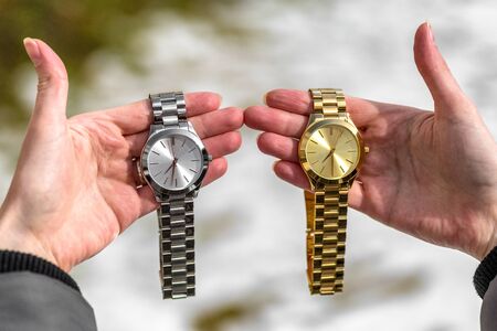 Women's golden and silver wristwatches holding by girl's hand