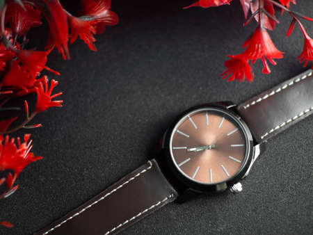 Brown wrist watch on gray background and red flowers