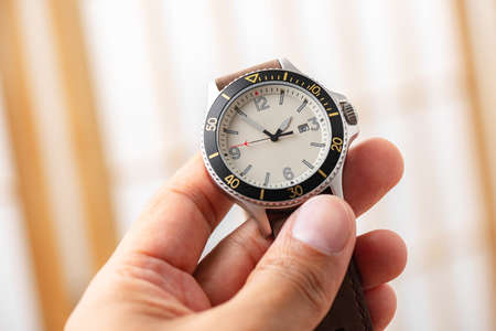 Close up at casual men wristwatch with cream dial and leather strap. Men accessories concept.