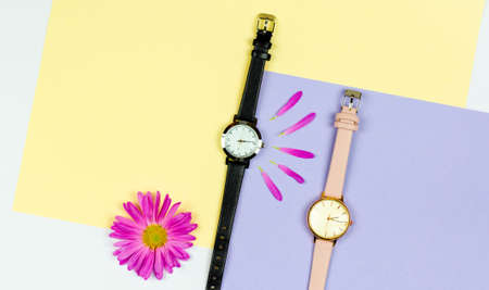 Stylish womens watch on a colored background with flowers and place for text