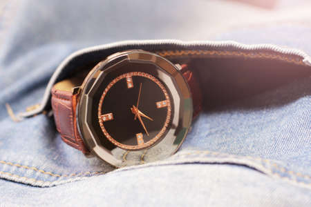 Beautiful blue denim wrist watch for men and women with white background.