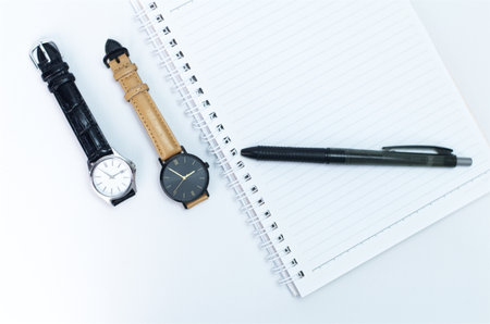 Elegant Watches, Pen, and Notebook Arranged on a White Desktop