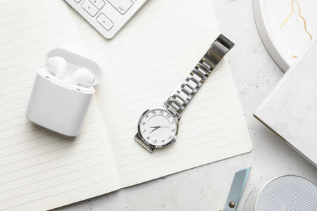 Stylish wristwatch, notebook and earphones on light background