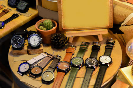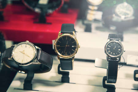different watchs in the store background.