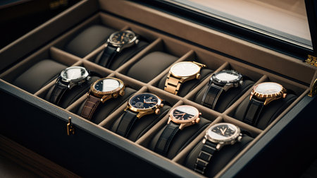 Collection of elegant watches resting on a dark blue velvet inside a luxurious wooden watch box, showcasing their exquisite design and craftsmanship