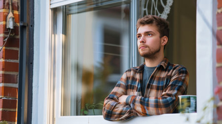 A man stands in front of a white door, looking out into the street. The scene is set in a residential area with a brick walkway and a row of potted plants. The man is waiting for someone or something