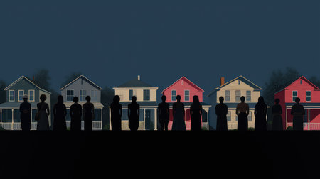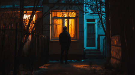 A person stands in the shadows outside a house with glowing windows during a quiet evening in a suburban neighborhood