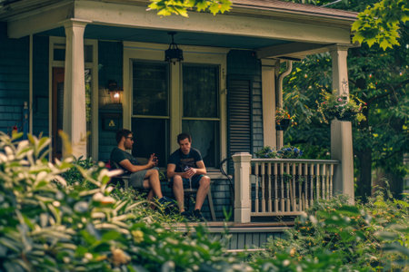 Law enforcement officers interviewing a concerned resident at home entrance during sunset. for police work, community safety, law enforcement, or domestic incident concepts.