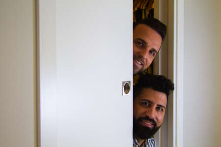 Curious man peeps through a closed gate, he is very surprised and looks with interest behind someone else fence.