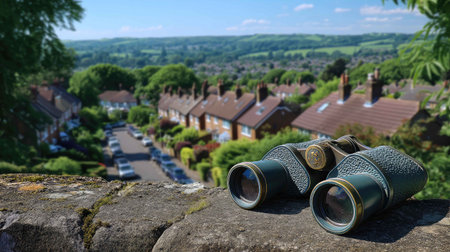 A pair of binoculars rests on a stone wall, offering a perfect view of a lush rural landscape. The scene captures the essence of exploration and outdoor adventures.