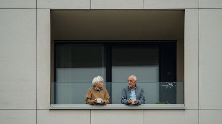 Elderly couple sitting side by side on a modern balcony with coffee mugs while a drone hovers nearby against a minimal architectural background.