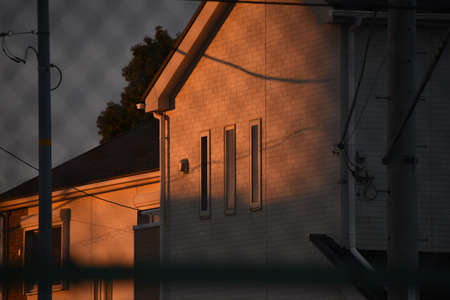 Home with balconies outdoor stairs and fence against sun and sky at sunset. Home exterior view with a vast grassy terrain in the foreground.
