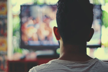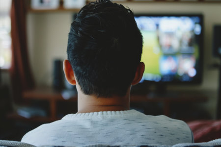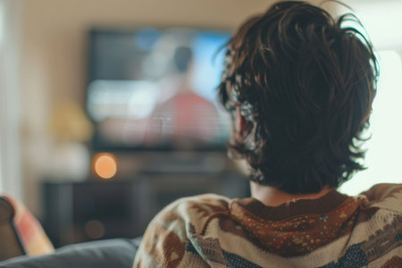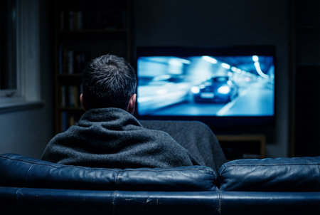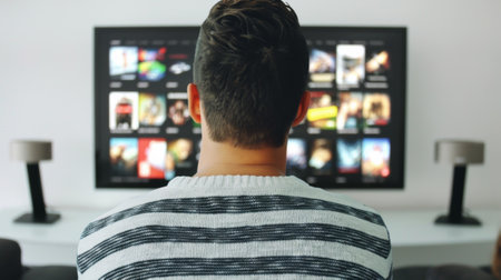 A cozy scene of a male individual seated on a couch, engaged in watching movies on a large television screen, surrounded by modern living room d
