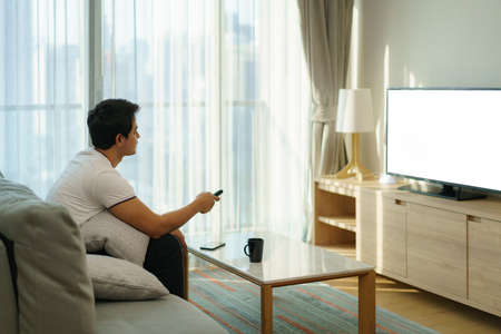 An Asian man holds a TELEVISION remote and is pressing the channel while watching TV on the couch in the living room at home.
