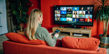 A person sits on a couch at home watching a smart TV screen filled with movie options. The user is deciding what to watch for evening entertainment.