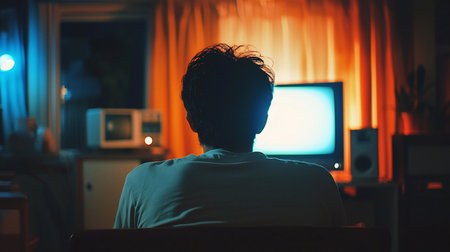 A man sits with his back to the camera, watching an old television in a dimly lit room. Orange curtains and a vintage aesthetic create a nostalgic mood.