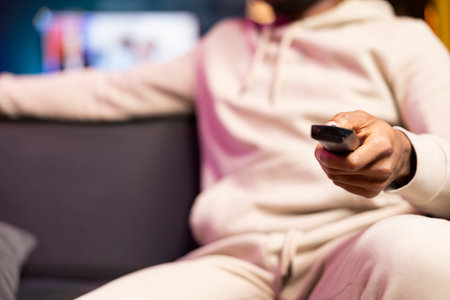 Man zapping through TV channels using remote, relaxing on couch in living room used as home theatre, close up shot. BIPOC person sitting on sofa, using television set to stream entertainment media