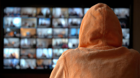 Individual wearing an orange hoodie is focused on a virtual meeting displayed on a large screen, showcasing a grid of participants.