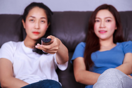 two best friends watching tv with remote on sofa in living room at home
