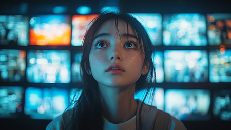 Woman, Back View, Observing Wall of Multiple Screens Showing Colorful, Dynamic Content