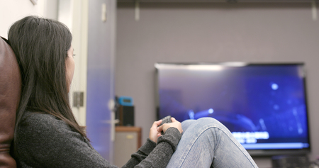 A Beautiful woman watching TV sitting on couch at home