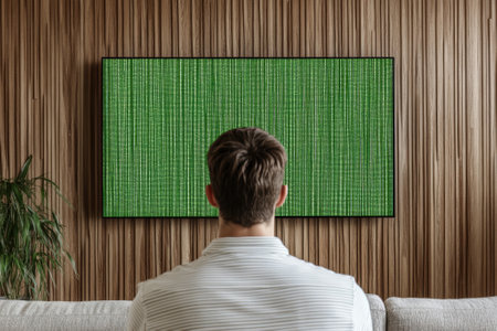 Man Watching Television with Green Screen in Modern Living Room Design.