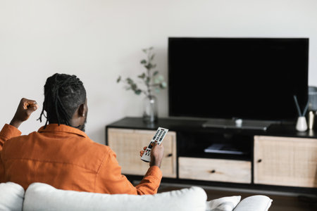 African american man cheerfing for favourite team, watching sports game on TV, television set with empty screen