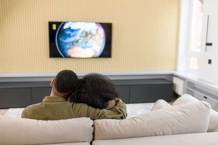 Rear view of African couple sitting on sofa with glasses of red wine and looking at widescreen TV hanging on the wall, they watching movie in the evening