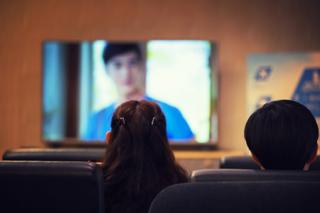Rear view of Relaxed young couple love sitting on on sofa watching TV in living room