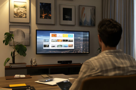 Person sits at a desk in a cozy room, looking at a large TV screen filled with vibrant images during the evening.