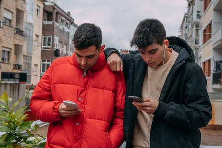Group of young people taking selfie with smartphone. Father and sons enjoying holidays before start school. Trendy family sharing media with remote friends. Happiness, technology, togetherness concept