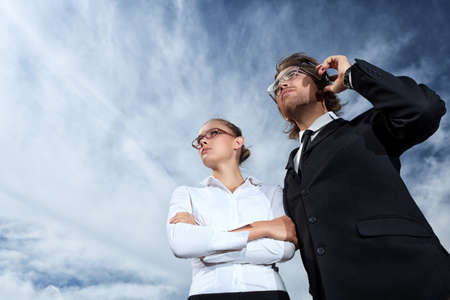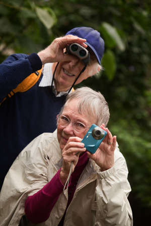 Young man and woman lifeguards on duty or tourist couple looking through binocular studio shot on gray