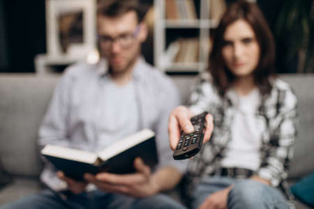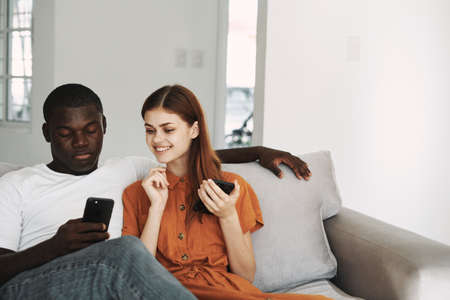 Young international couple of white woman and black man sit on couch at home, look at side. Violet wall background with free space for text.