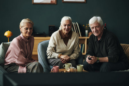 Portrait of three senior Caucasian people sitting together on sofa watching television, two women and one man smiling and looking toward camera, coffee mugs on table