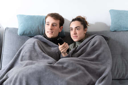 Portrait of an excited young couple relaxing on a couch at home while watching TV and eating popcorn