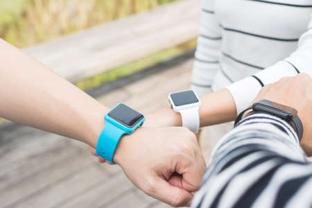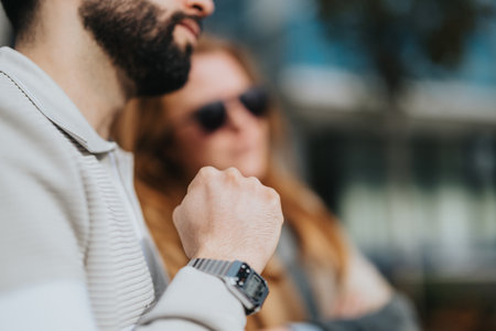 Business people discussing work in an outdoor meeting, focusing on a watch and sunglasses