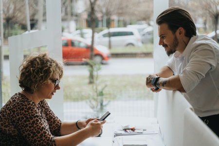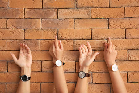 Male and female friend checking time on wristwatch while leaning on gray wall in daytime on city street