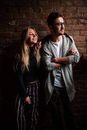 Happy stylish young family couple in love hipsters having fun against glass wall