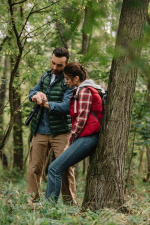Two Young Traveler with backpack, are holding map relaxing and taking photo in greens jungle and enjoying with outdoor forest on background Summer vacations and Lifestyle hiking concept.