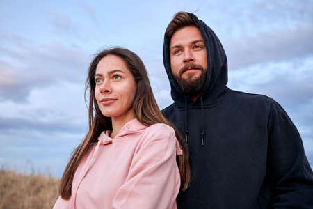 Couple in wonderful landscape preparing for running jogging, posing at camera together, looking at side, in sportive hoodie. fit slim people with athlete body lead healthy lifestyle, outdoors