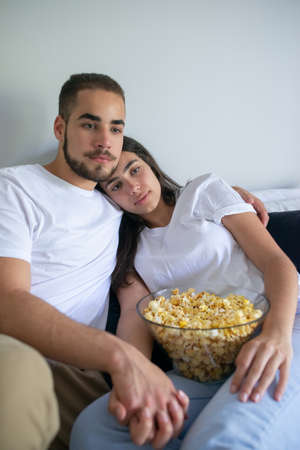 Loving couple eating popcorn and watching TV. Woman and man sitting on sofa, holding bowl of popcorn. Food, leisure concept