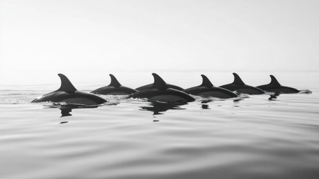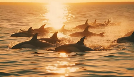 A pod of dolphins swims gracefully at sunset, bathed in golden light.