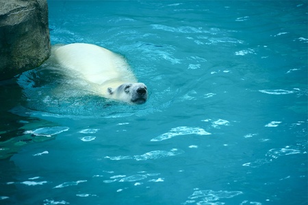 Polar bear is swimming in the pool at the zoo. An animal in captivity. Northern Bear.